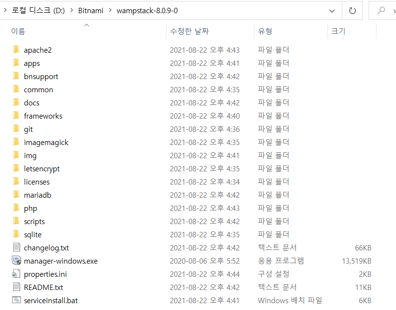 설치 경로인 "D:\Bitnami\wampstack-8.0.9-0" 폴더도 정상적으로 세팅되었네요!
