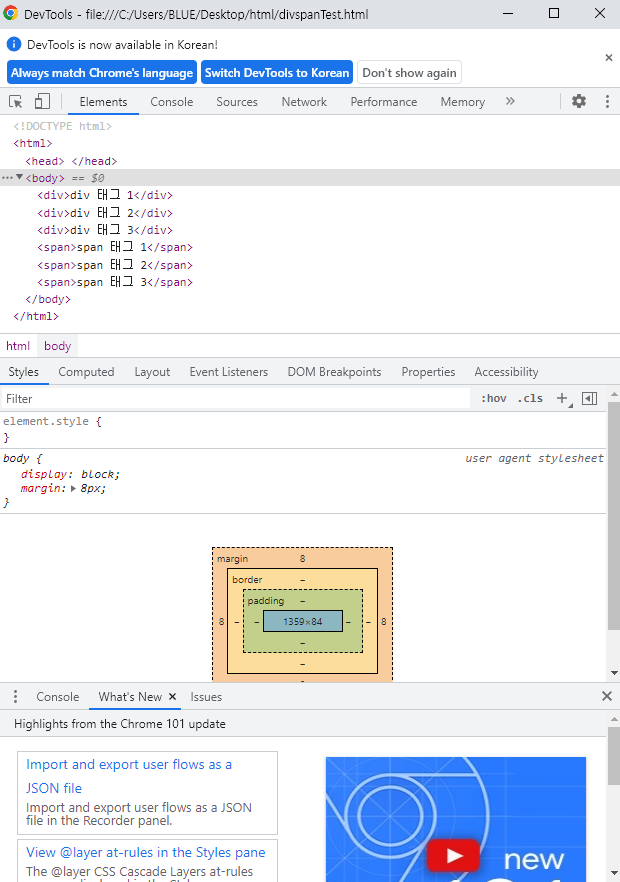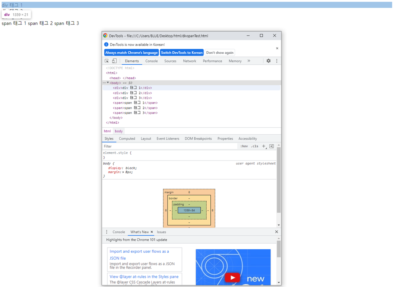 그래도 태그의 명확한 차이점을 알아보기 위해 실행 결과 화면에서 개발자 도구를 실행해봅시다!