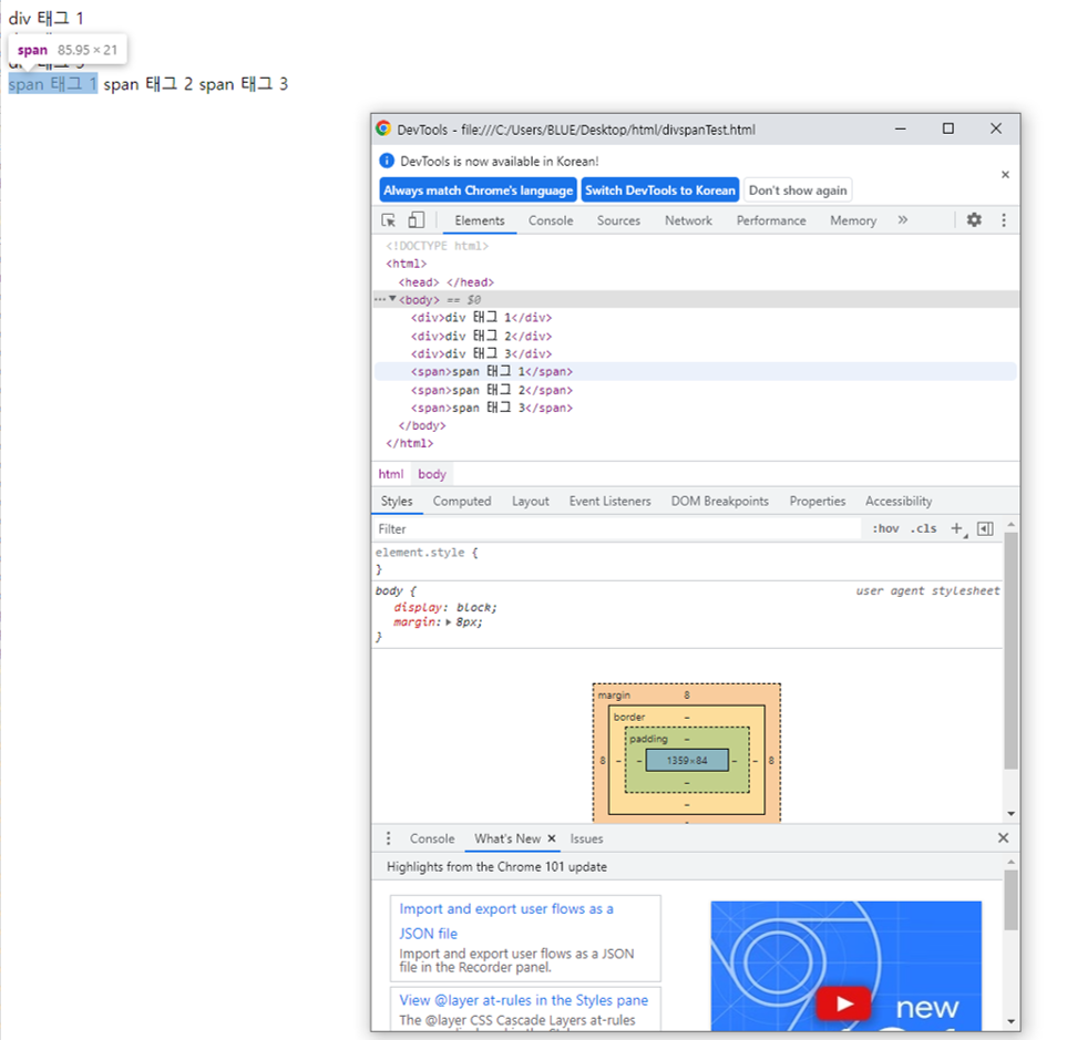 <div> 태그와 다르게 <span> 태그는 글자 크기에 맞게끔만 파란색으로 지정된걸 볼 수 있네요😮