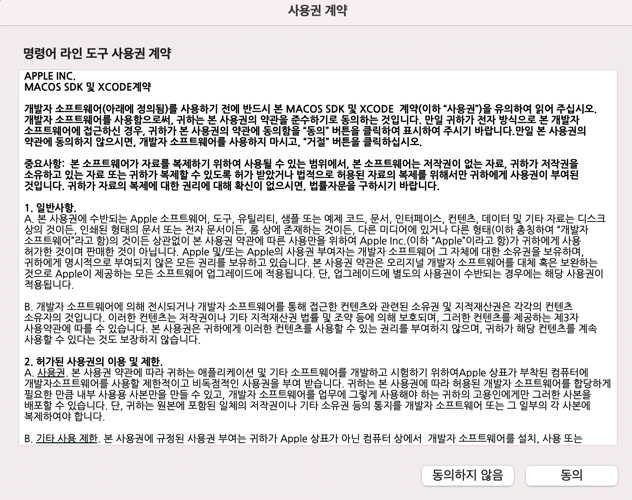 3. git 설치할거면 동의하면 알아서 설치되고 완료되면 Mac OS에서 깃 사용 가능.
