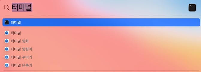 tmi : 터미널로 접근하는 방법은 우상단 돋보기 모양 클릭한 다음 검색창에 '터미널' 검색하면 된답니다.