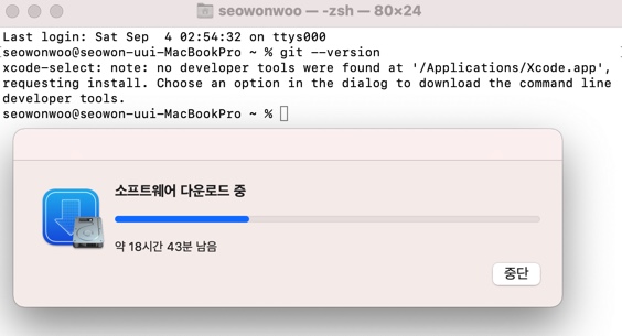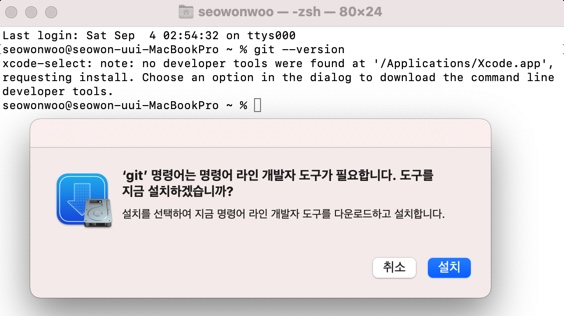 2. 터미널 실행해서 git 명령어 입력하고 엔터쳐서 git 설치 안되어있으면 설치할거냐고 물어봄.