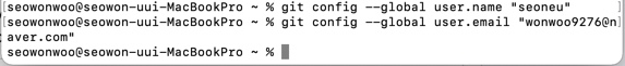 저는 제 깃 계정에 설정된 이름과 메일인 seoneu, wonwoo9276@naver.com으로 설정해주었답니다!